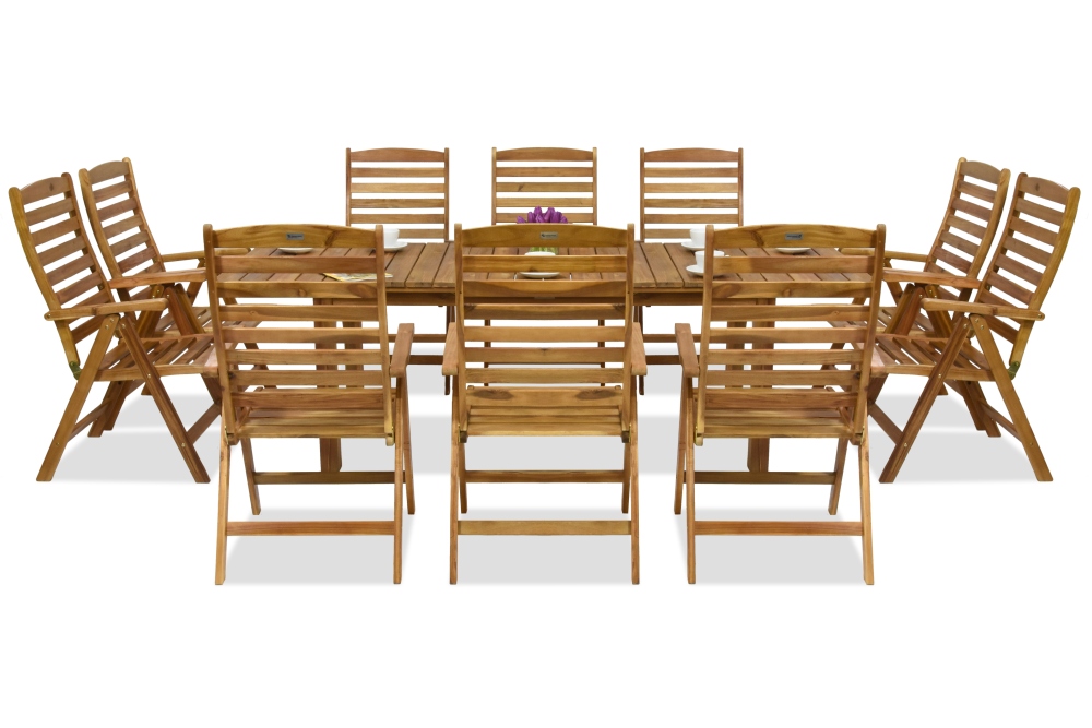 Ce grand salon de jardin en bois comprenant la table Jakarta et les dix chaises Bombay de Garden Point est magnifique à l'intérieur comme à l'extérieur.