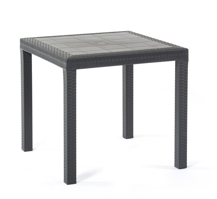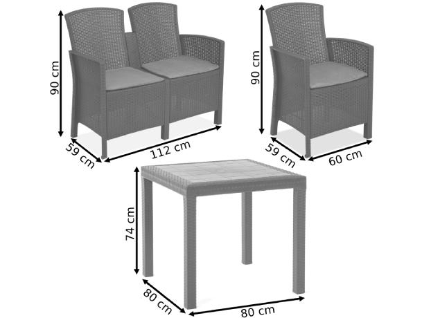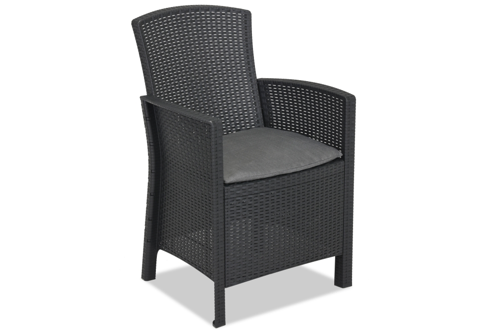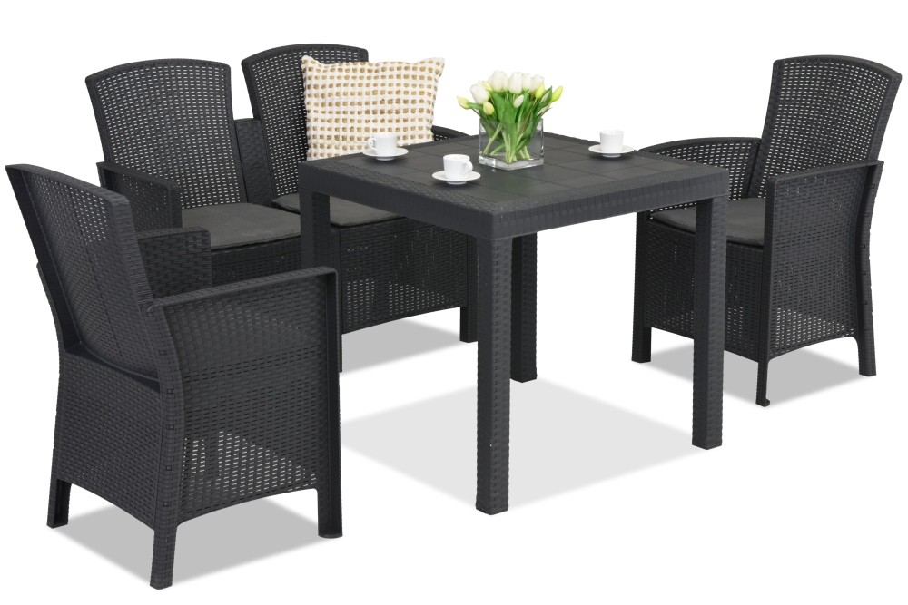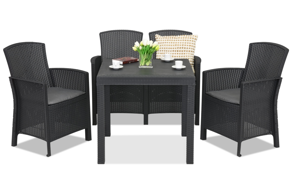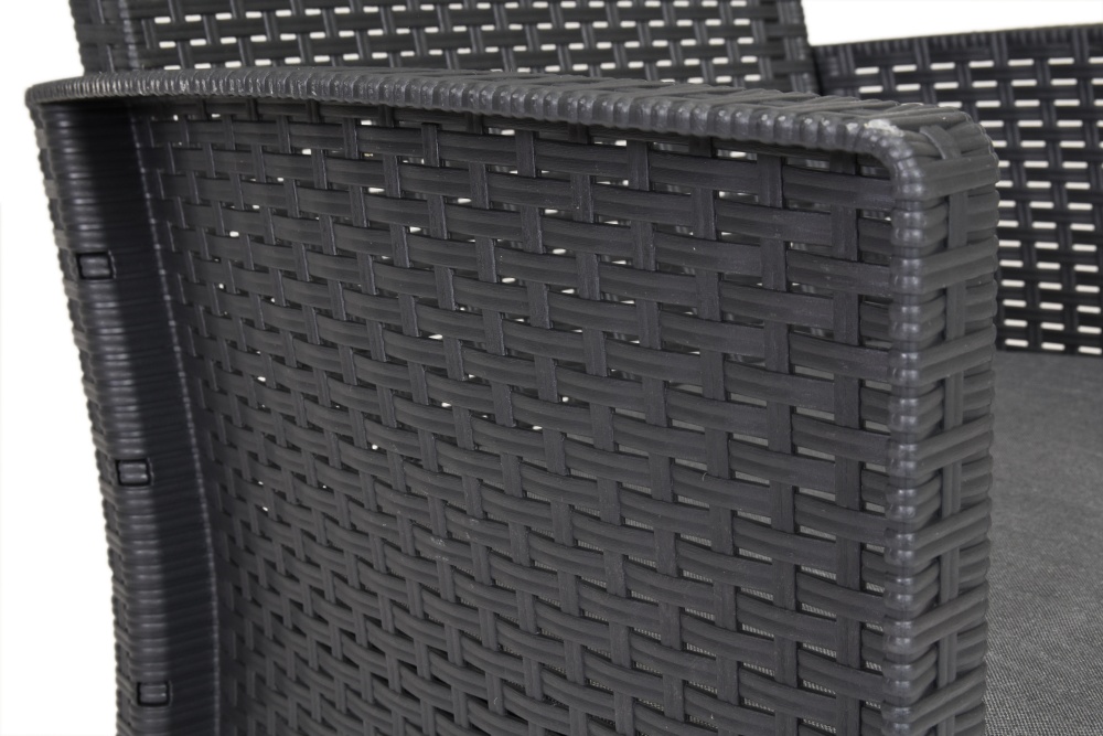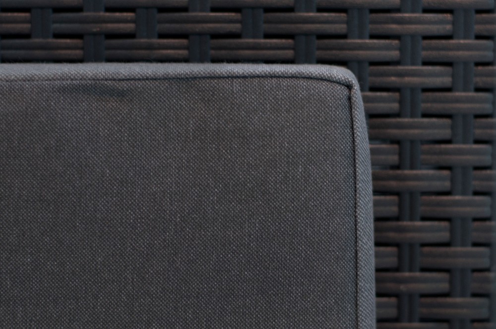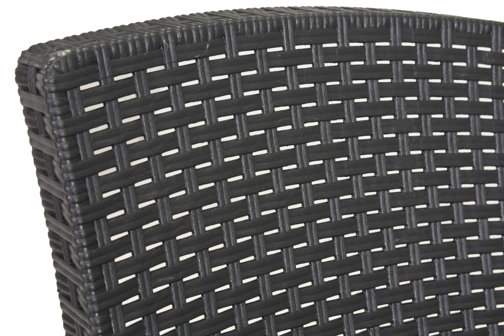 - Le mobilier est fabriqué en résine tressée synthétique de couleur anthracite foncé.